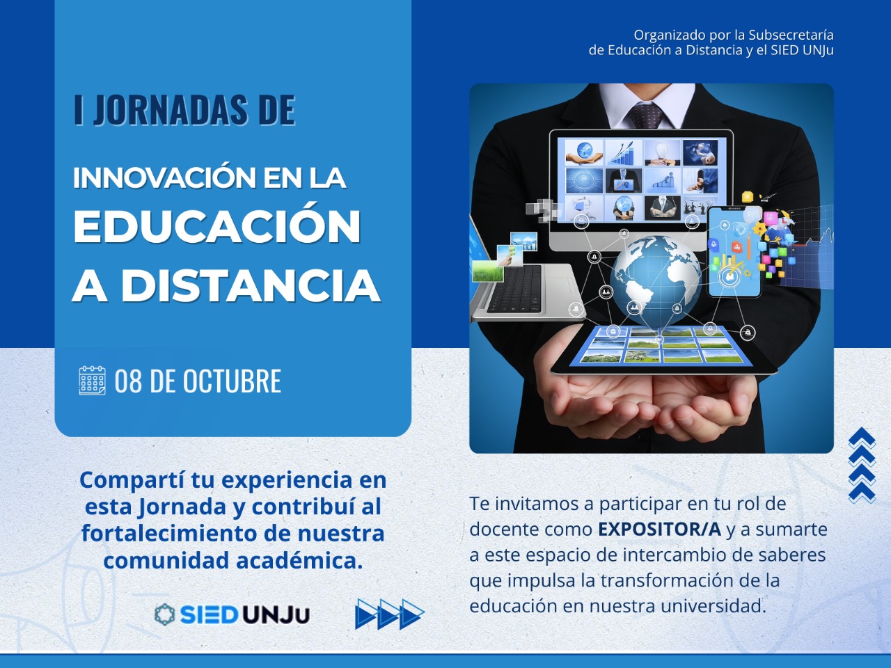 La Universidad Nacional de Jujuy, a través de la Subsecretaría de Educación a Distancia y el Sistema Institucional de Educación a Distancia (SIED UNJu), anuncia la realización de las Primeras Jornadas de Innovación en la Educación a Distancia, que se llevarán a cabo el miércoles 8 de octubre de 2025, de 9 a 19 hs, en modalidad virtual.